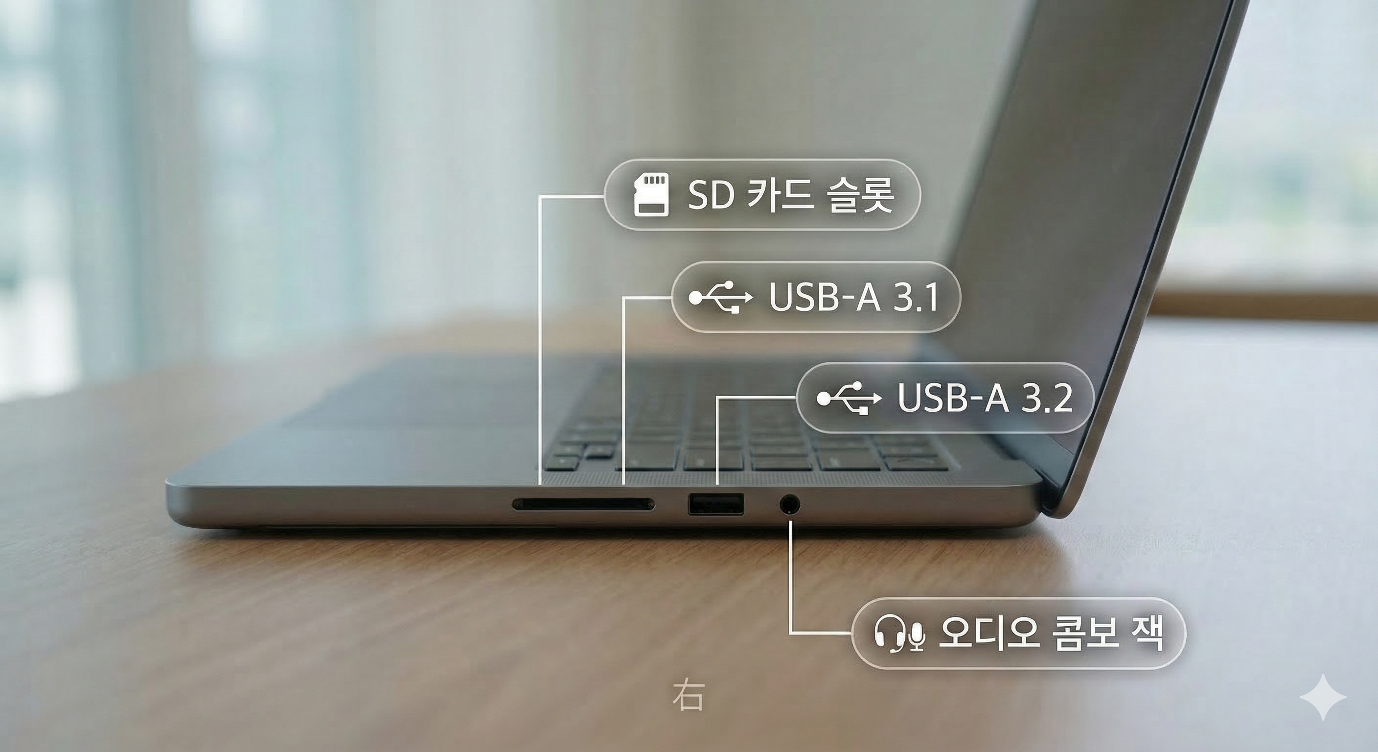 오른쪽 면은 주로 마우스 연결이나 메모리 카드 전송 등 편의성을 위한 포트들이 배치됩니다.