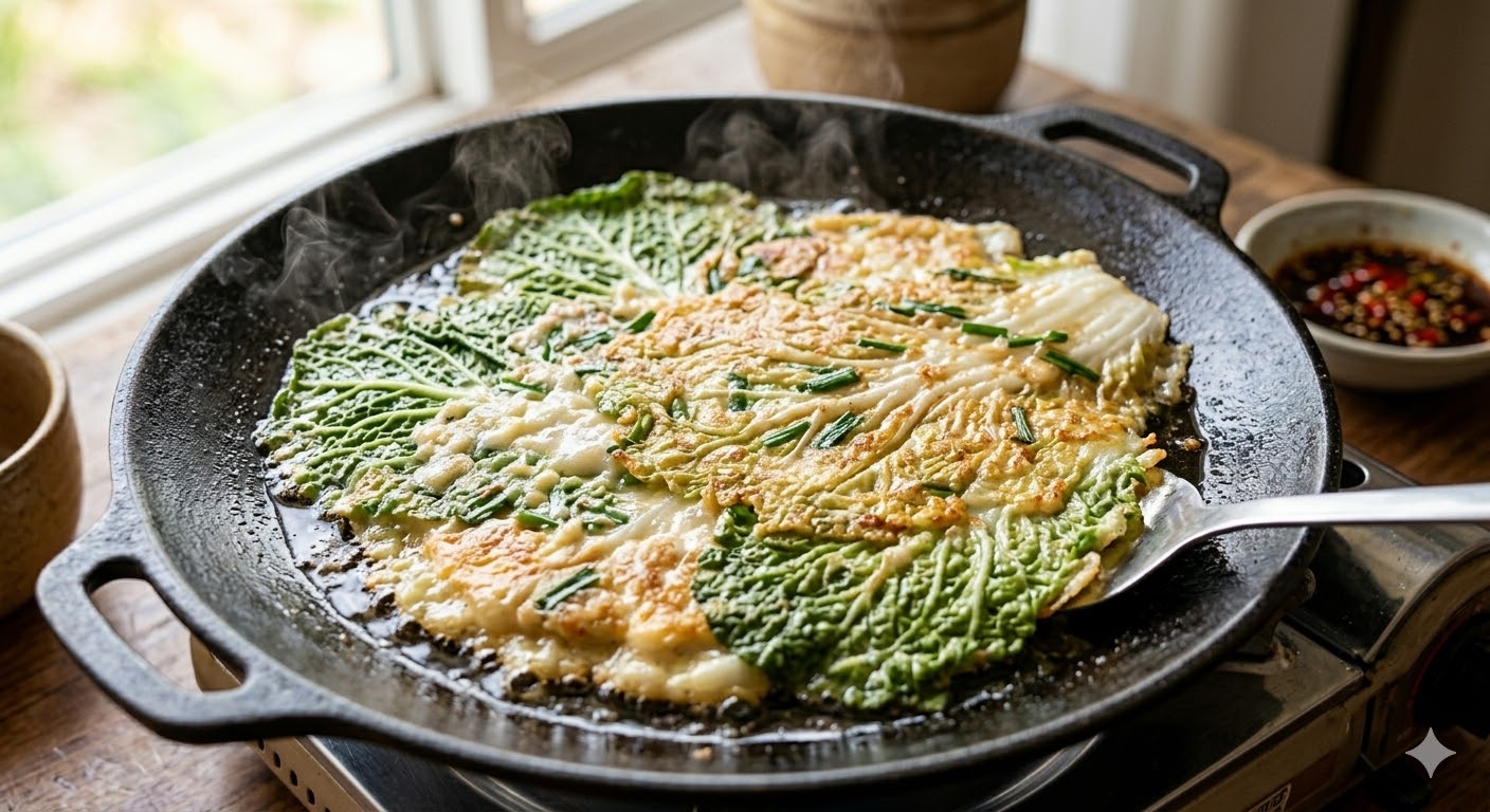 달큰한 봄동 잎을 통째로 부쳐내면 고소한 맛이 극대화됩니다. 간식이나 술안주로도 그만이죠