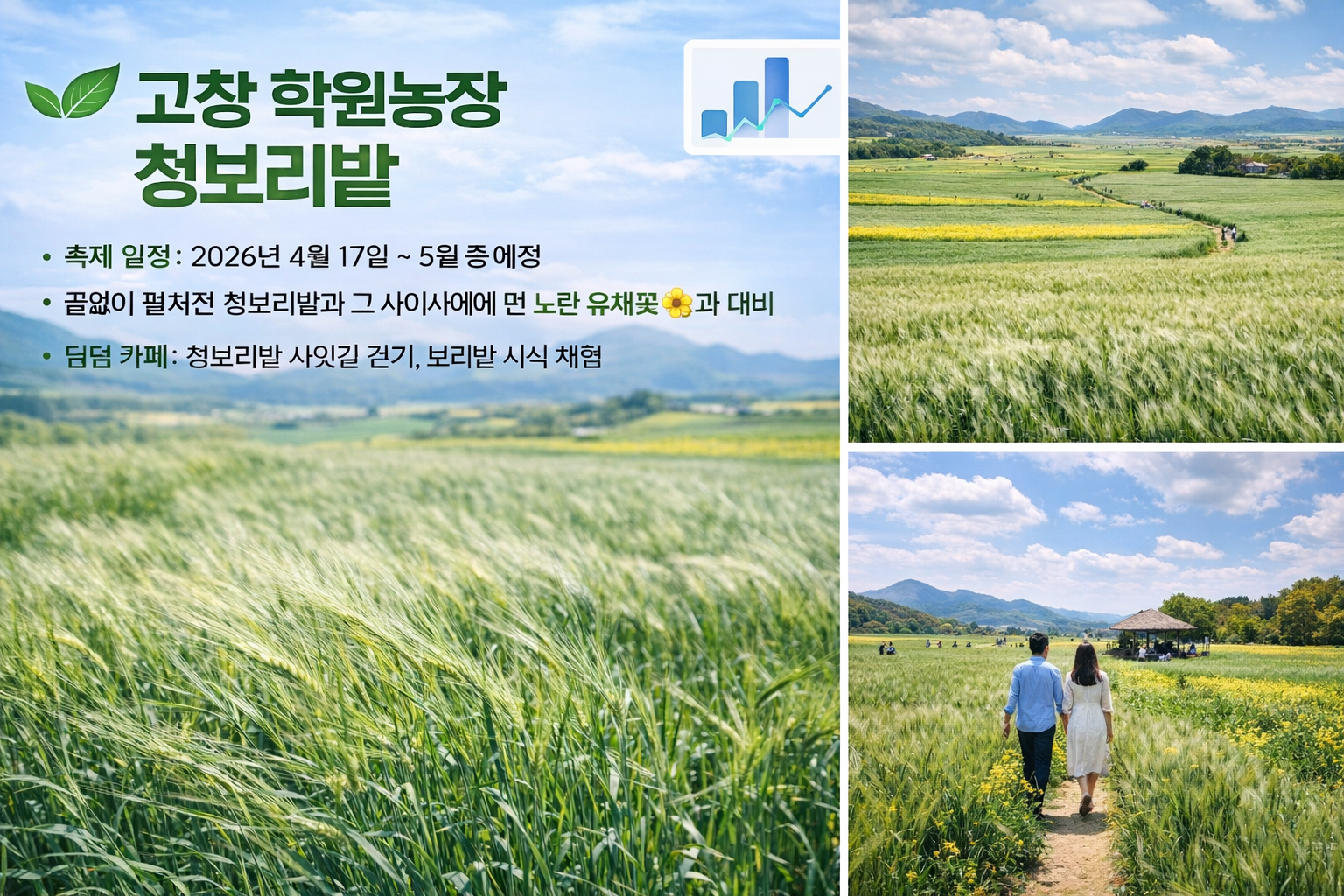🌿 초록빛 힐링 여행전북 고창 학원농장 청보리밭 축제 2026벚꽃 시즌이 지나갈 즈음,눈이 시원해지는 초록빛 풍경을 보고 싶다면전북 고창 학원농장 청보리밭이 최고의 여행지입니다.끝없이 펼쳐진 청보리밭과 노란 유채꽃의 대비는마치 영화 속 장면 같은 풍경을 만들어 냅니다.특히 이곳은 여러 드라마와 영화 촬영지로도 유명해매년 봄이면 수많은 여행객이 찾는 힐링 명소입니다.📅 2026 고창 청보리밭 축제 일정축제 기간: 2026년 4월 17일 ~ 5월 초 예정위치: 전북 고창군 공음면 학원농장추천 방문 시기: 4월 말 ~ 5월 초이 시기에는 청보리 색이 가장 짙어져초록빛 장관을 볼 수 있습니다.🌾 고창 청보리밭의 매력1️⃣ 끝없이 펼쳐진 초록 지평선학원농장의 가장 큰 매력은마치 초록 카펫처럼 펼쳐진 보리밭입..
